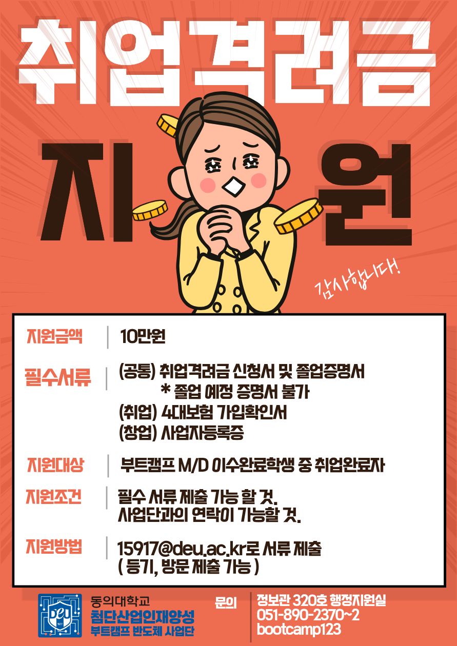 취업 격려금 신청을 원하는 학생은 필수 서류를 15917@deu.ac.kr 메일 또는 등기/방문 제출하여 주시기 바랍니다.